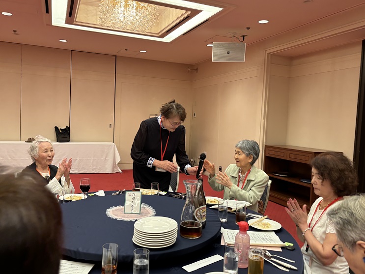 総会に引き続き懇親会では、互いの近況報告後、会員によるマジックショウでは大いに笑い、学生時代のコーラス部員中心に懐かしい校歌を合唱し、気持ちはすっかり女坂を上り通学していた頃のようでした。